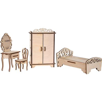 В комплект входят шкаф для одежды, кровать, туалетный столик, стул. Дверки шкафа открываются. Внутри расположены 3 вешалки для одежды. Ящичек туалетного столика выдвигается.Мебель подходит для кукол до 12см, мебель уже собранная. НИЧЕГО СОБИРАТЬ И КЛЕИТЬ НЕ НАДО!!!